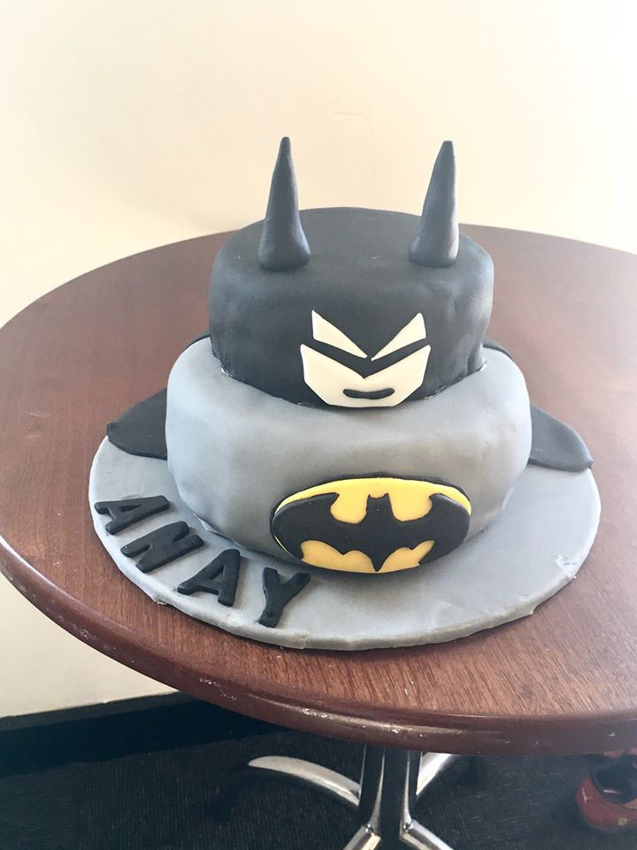 Victoria sponge cake, jam and vanilla buttercream inside, 2 tiered, Smartie filled lower tier, edible fondant covered cake, cake board & cape.