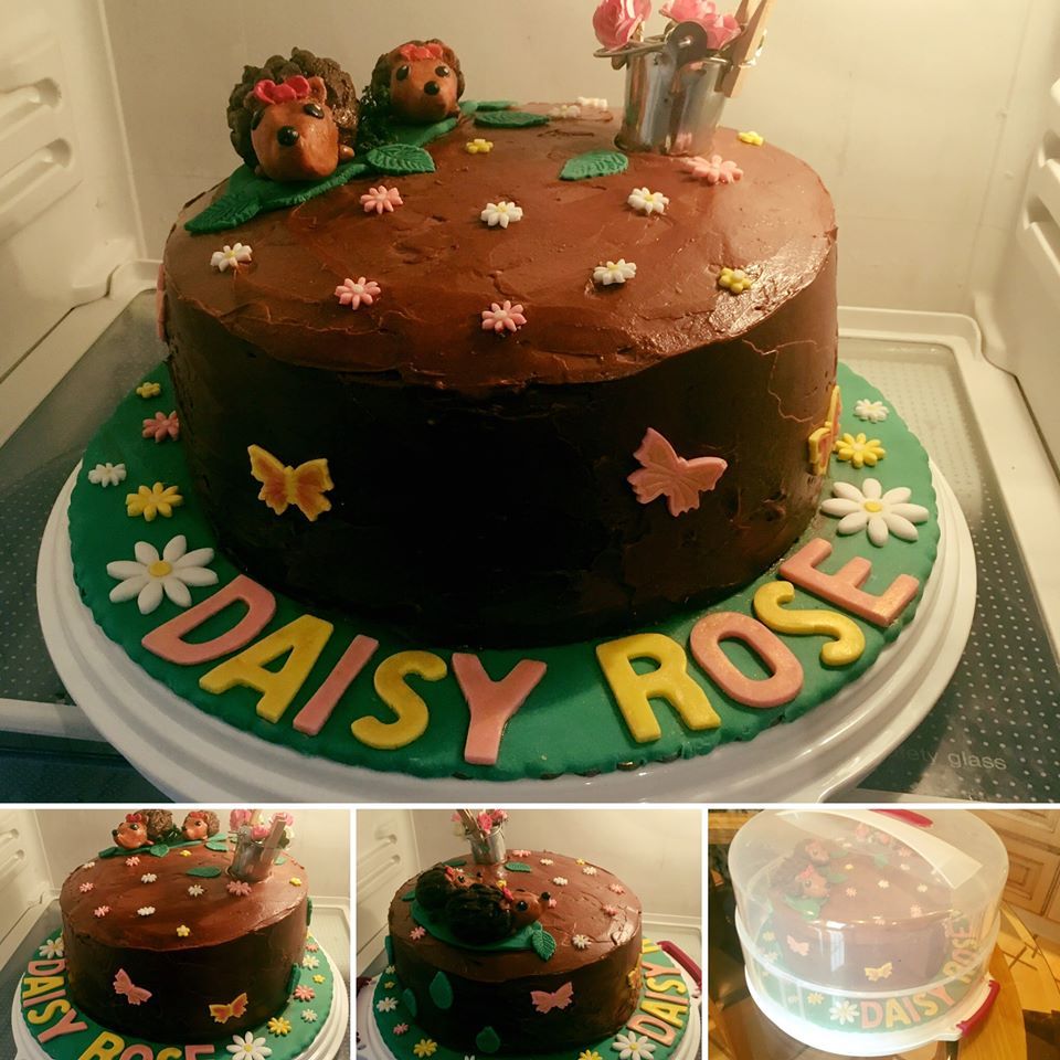 Vegan chocolate cake, 4-tiered, vegan chocolate buttercream, edible daisies, butterflies, name and leaves. Non-edible hedgehogs, bucket & flowers inside bucket.