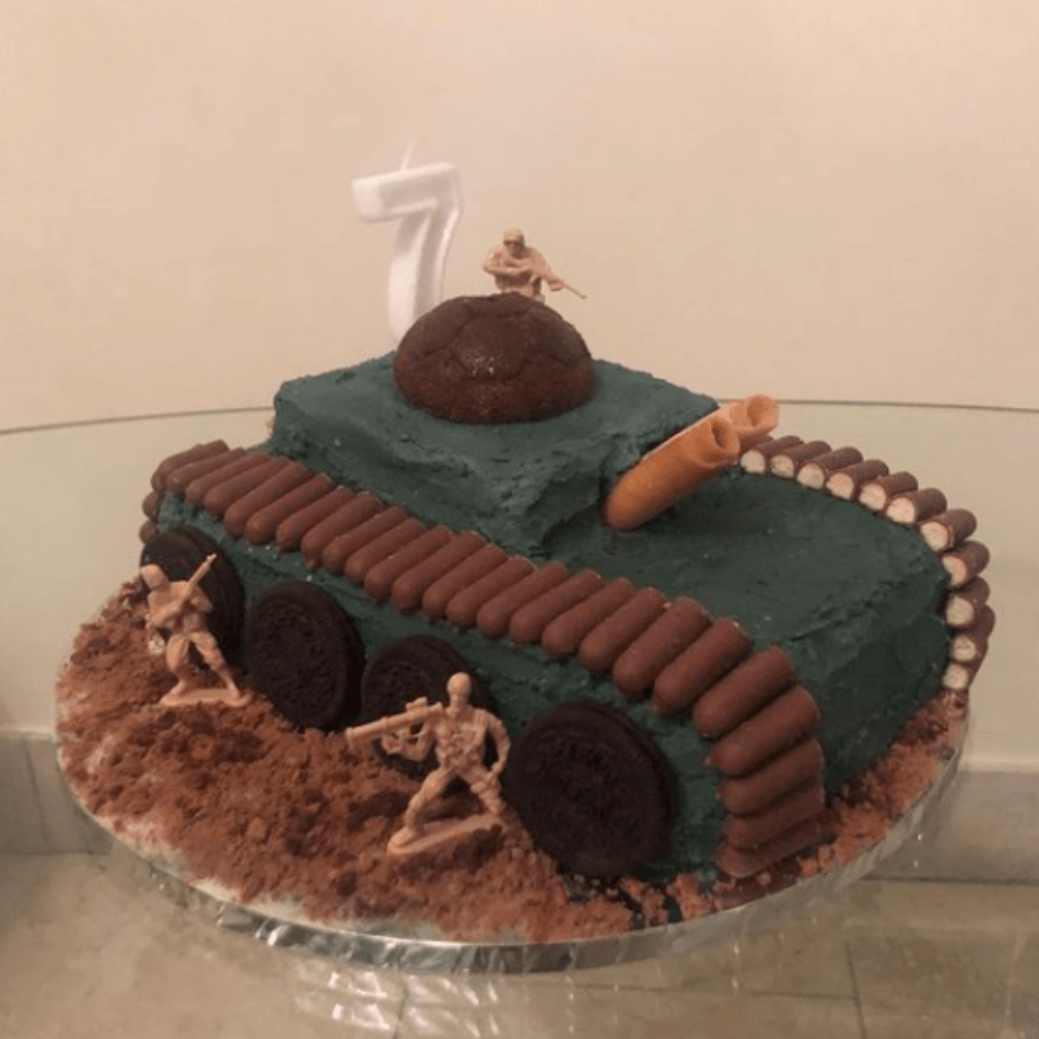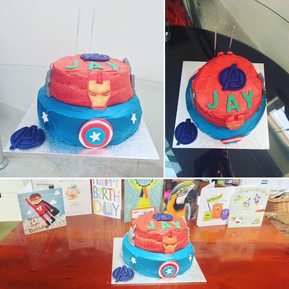 Victoria sponge cake, 2-tiered, vanilla buttercream and strawberry jam layered inside, red and blue buttercream covered with edible fondant Iron Man mask, Captain America shield, Thor hammer and Avengers logo. Two sparklers for wow factor!