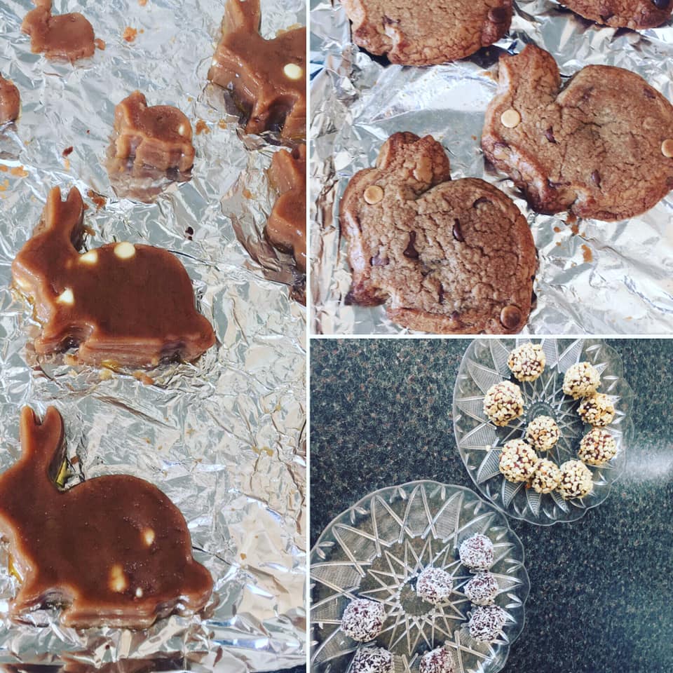 Milk & white chocolate chip rabbit shaped cookies. Chocolate truffles covered in mixed chopped nuts or desiccated coconut (eggless) also shown.