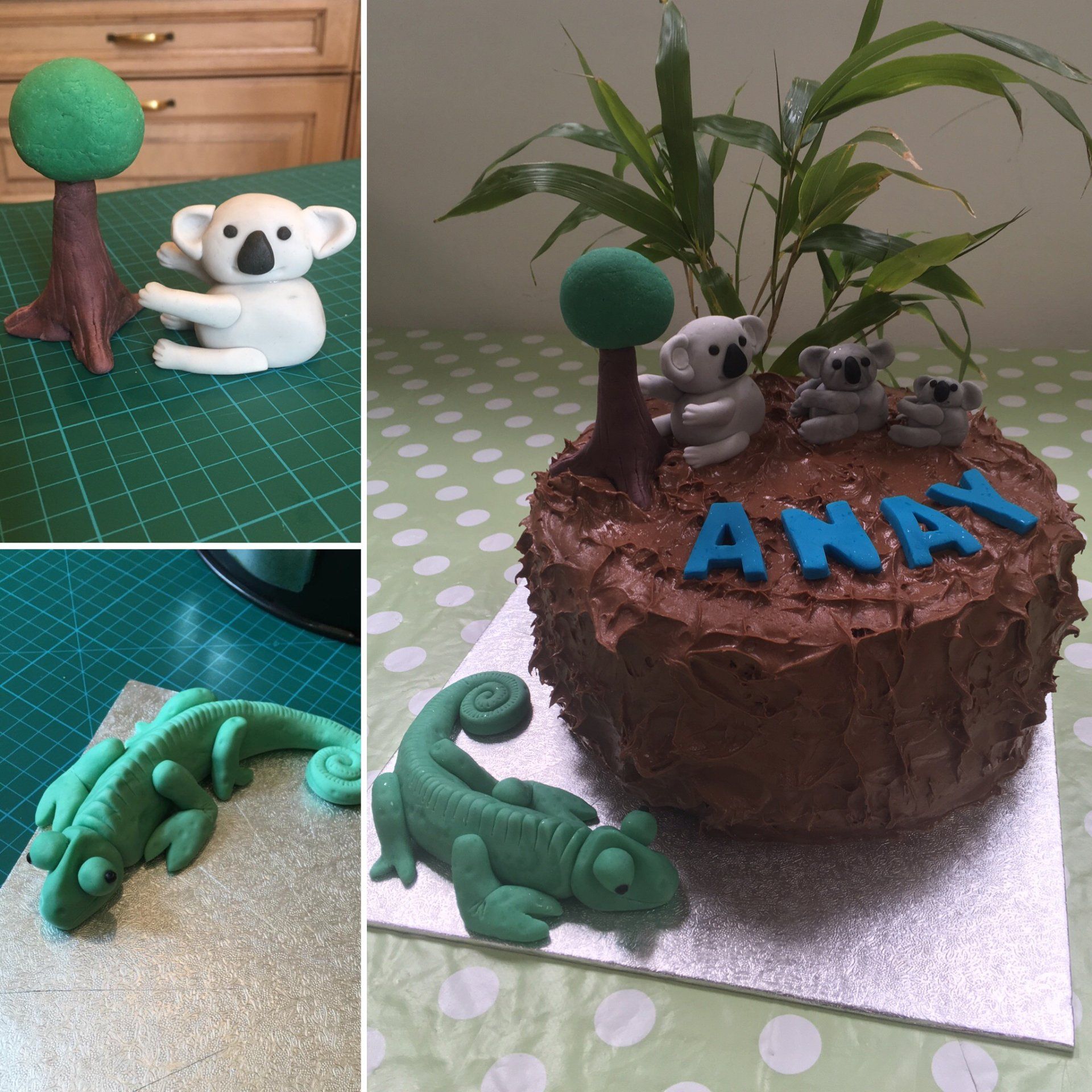 Chocolate sponge, 2-tiered, chocolate buttercream, edible fondant tree, koala family, chameleon & name. Real bamboo leaves from our garden.